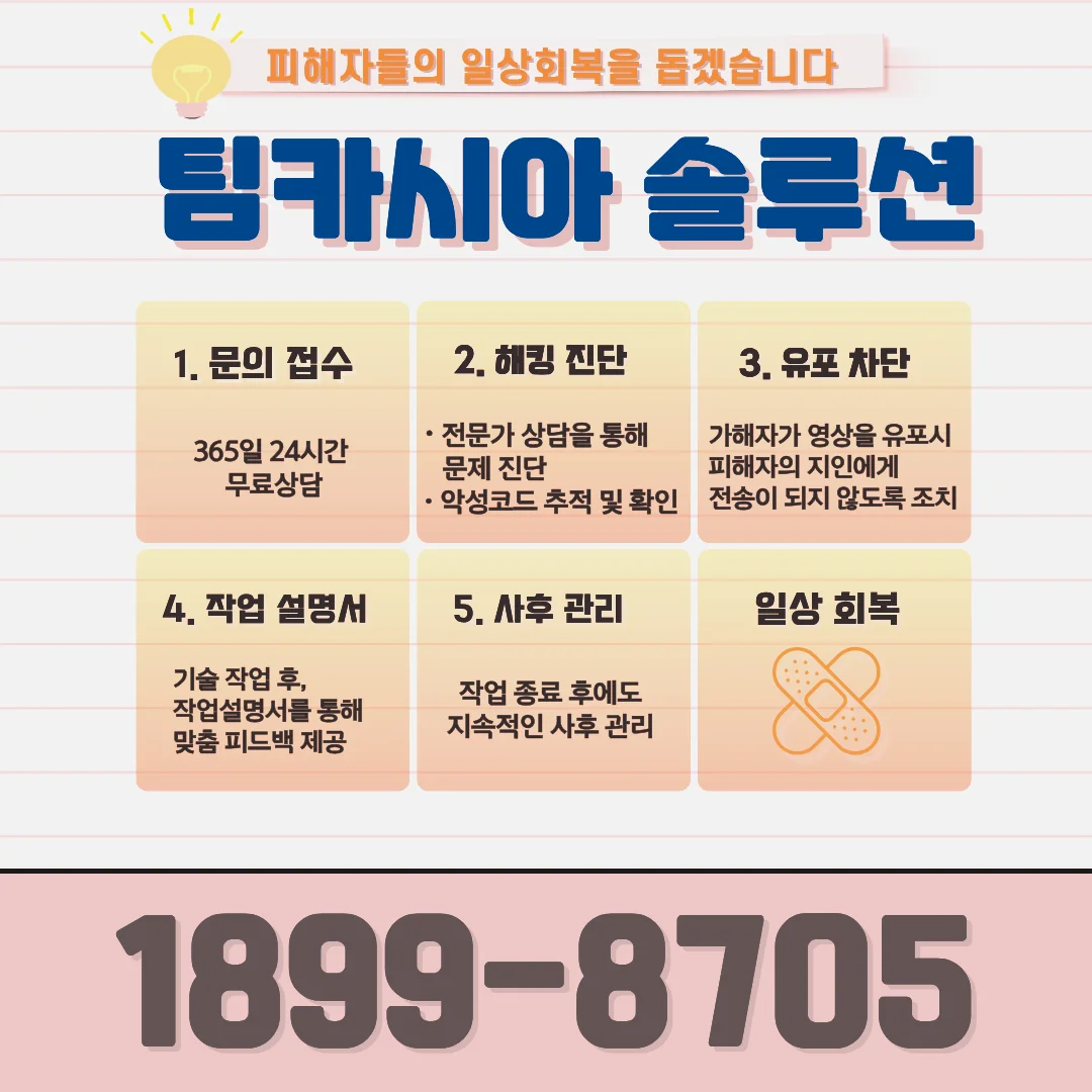 심리적 지원: 수치심과 공포로 인해 일상 생활이 불가능할 때는 가족·친지에게 상황을 알리고, 필요시 심리상담을 받으세요. 숨기려 할수록 스트레스와 고립감이 커질 수 있습니다.