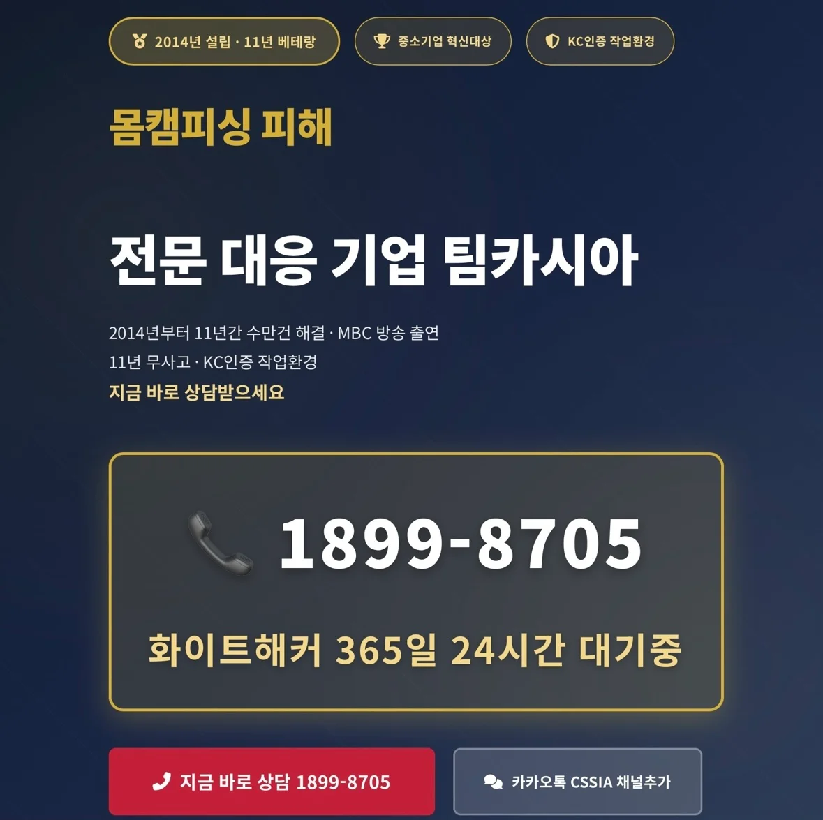 팀카시아(CSSIA)는 11년 무사고 경력 화이트해커 전문가가 365일 24시간 직접 대응하여 몸캠피싱 피해로부터 안전하게 지켜드립니다.