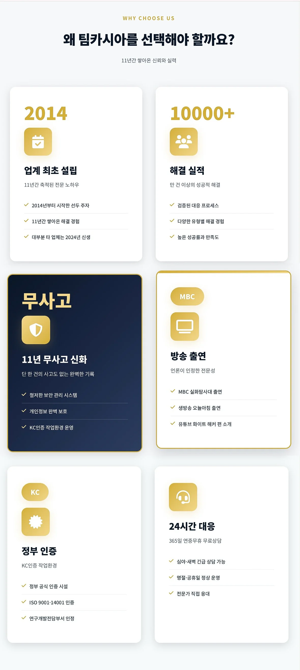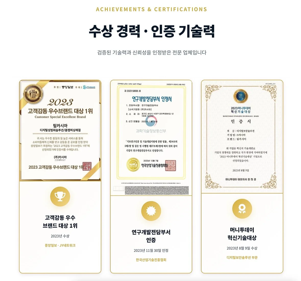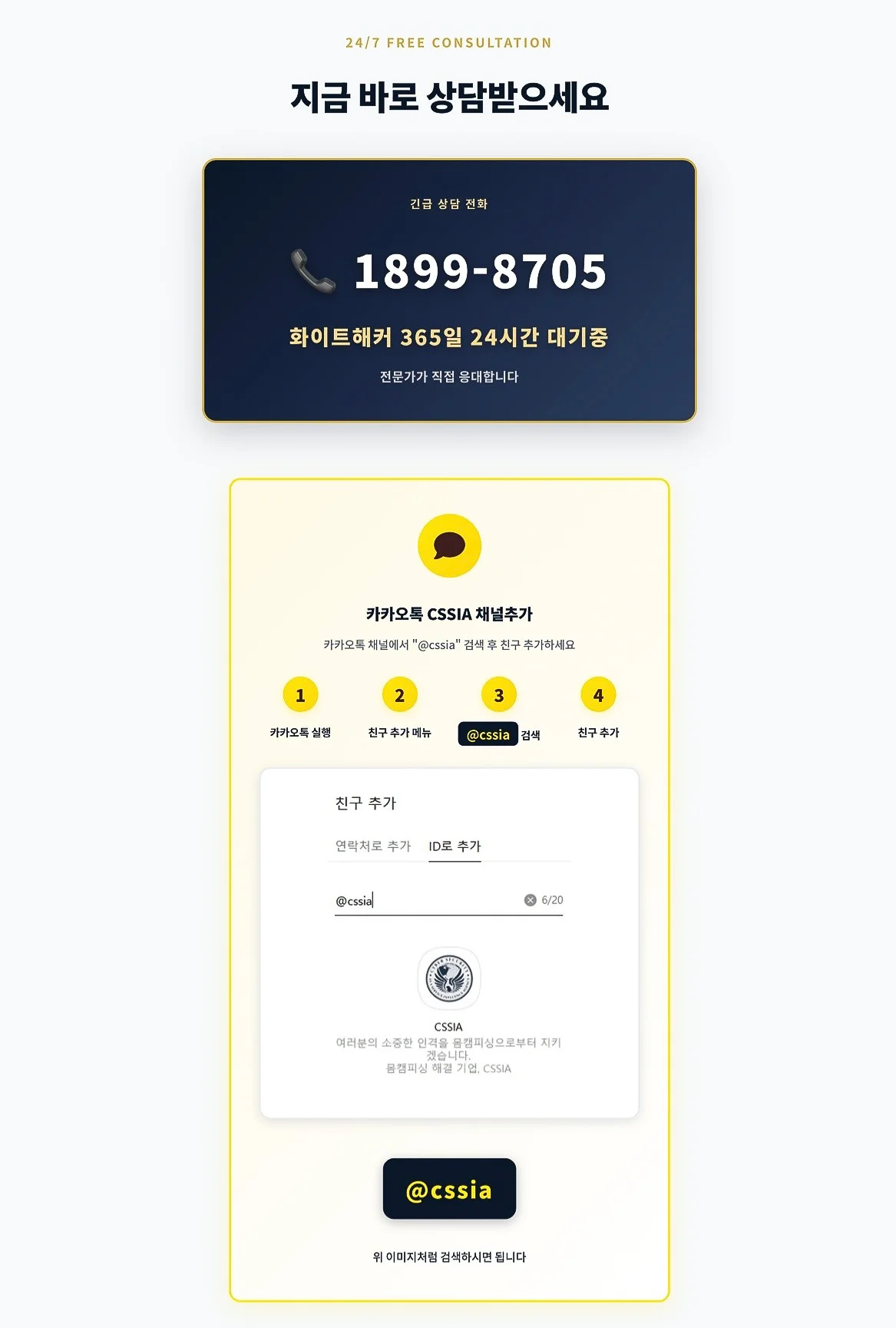 카시아는 365일 24시간 실시간 대응을 제공하며, 단순 상담이 아니라 완전한 해결을 목표로 합니다.